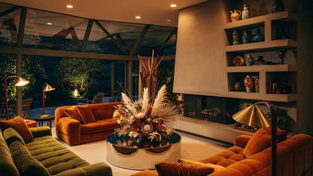 A cozy modern living room with warm lighting, featuring a coffee table with books, decorative items, and autumn leaves, surrounded by comfortable sofas and a stylish lamp