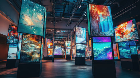 Experience a captivating modern exhibition space filled with vibrant digital art installations. Bright panels create an immersive atmosphere, showcasing stunning visuals and creativity.