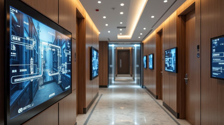 Modern office hallway with interactive screens and wooden panels. That the image is generated using AI.