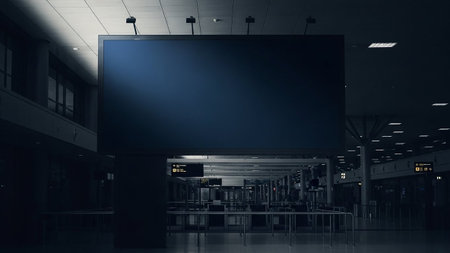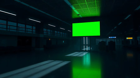 Vast, modern airport concourse featuring a prominent green screen billboard ready for custom content, bathed in atmospheric lighting and sharp shadows. Ideal for advertising, transport, or tech concepts.