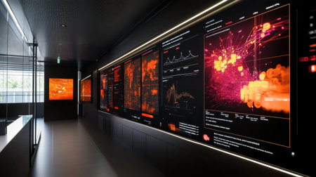 A sleek and modern workspace showcasing high-tech data visualization. The room features vibrant screens displaying complex analytics, perfect for innovation.