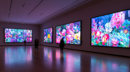Modern art gallery showcasing a collection of colorful digital artwork on a large video wall, creating an immersive visual experience