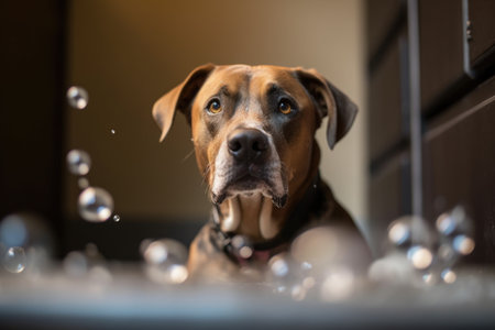 dog lying in bathtub, with water and bubbles, created with generative ai