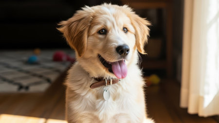 A close-up portrait of a young, fluffy golden retriever puppy sitting attentively indoors. The puppy has cream and light golden fur, soft floppy ears, and bright, expressive eyes looking slightly off-camera. Its mouth is slightly open with a pink tongue hanging out, giving it a cheerful expression. The puppy wears a brown leather collar with a shiny silver ID tag. The background is softly blurred, revealing a home environment with wooden floors and natural light from a window on the right side. In the distance, colorful dog toys are visible on a patterned rug.