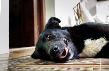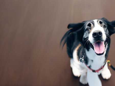 Cute black and white dog smiling with tongue hanging out. AI Generated.