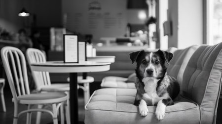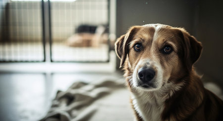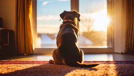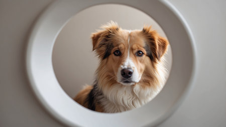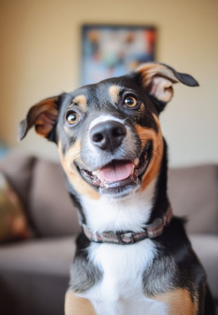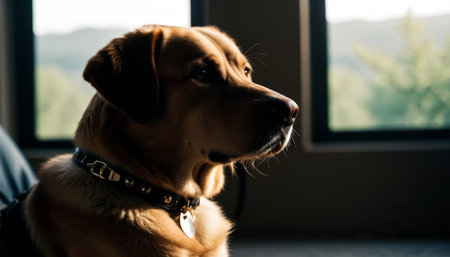 AI Generated. Dog with a collar sitting indoors in a bright room while looking calmly to the side