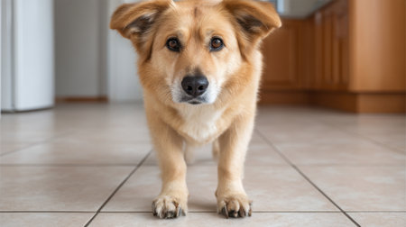 This image showcases a charming dog with floppy ears standing on a tiled floor indoors, exuding curiosity and a playful spirit in a cozy, well-lit environment.