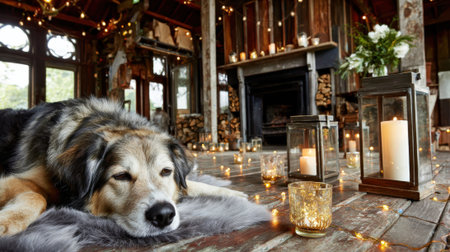 A fluffy dog rests on a rug near a fireplace adorned with candles and lanterns, creating a warm and inviting atmosphere.