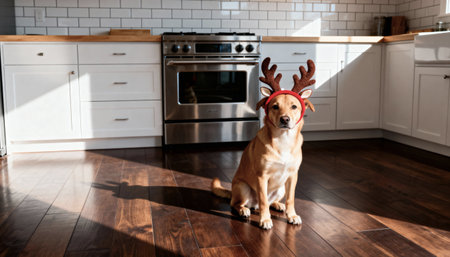 A charming dog with reindeer antlers sits patiently on a dark wood floor in a bright, modern kitchen, bathed in warm morning sunlight. A festive holiday pet portrait.