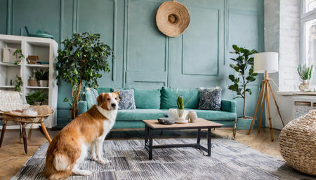 Stylish scandinavian living room interior of modern apartment with mint sofa, design coffee table, furnitures, plants and elegant accessories. Beautiful dog lying on the couch. Home decor. Template