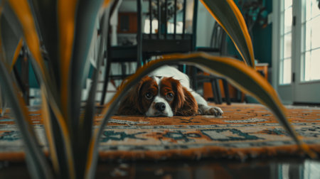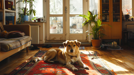 a dog lying down in sunny living room picture, Relaxing on the floor, realistic wallpaper.