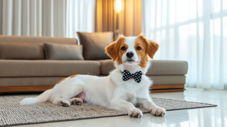 Stylish and Sophisticated Dog with Bow Tie in Modern Living Room Setting, Relaxing on Soft Carpet in Brightly Lit Space with Elegant Sofa