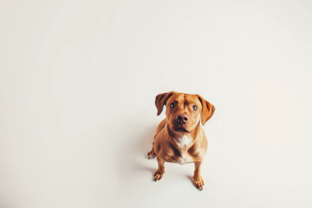 A playful brown dog sits on a clean, white surface, looking up with bright and curious eyes. The simplicity of the setting highlights the dog's friendly expression and character.