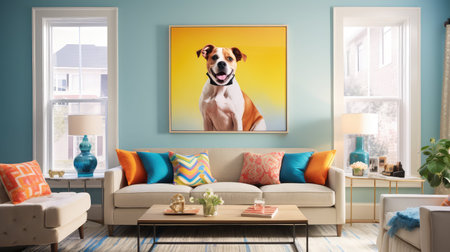 This image depicts a modern living room interior featuring a dog standing on a rug. The room includes a wooden dining table with chairs, a grey sofa, and a decorative vase with branches. The image is on a transparent background, making it suitable for various design applications. Key elements include a white door frame, a framed picture on the wall, and natural light streaming through a window.