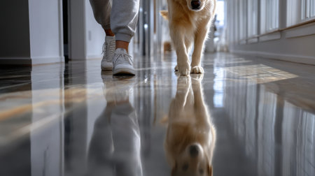 A person is walking a dog in a hallway. The reflection of the dog and the person can be seen in the shiny floor