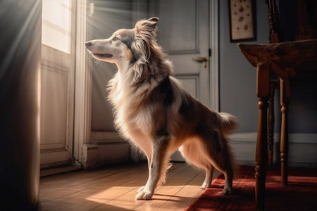 Excited and emotionally happy dog at home door entrance waiting the arrival of her master. Created with Generative AI technology.