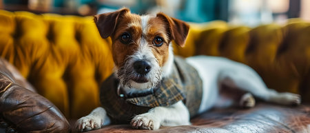 Dog Jack Russell Terrier in a checkered scarf on a sofa.