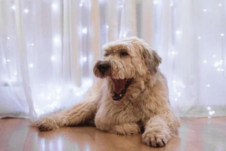 Long-haired South Russian Shepherd Dog with open mouth at home is resting on a floor on a background of white curtain with lights.