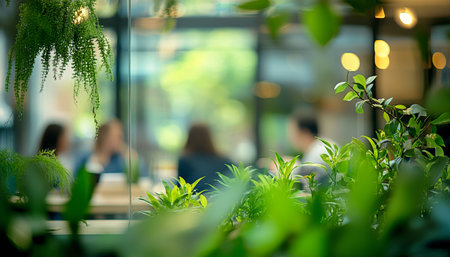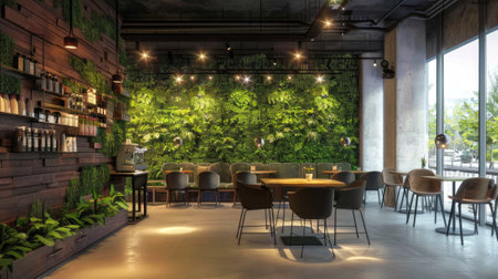 Cozy modern cafe with lush indoor vertical garden and seating area. Concept of urban greenery, eco-friendly design, indoor plants, relaxation space.