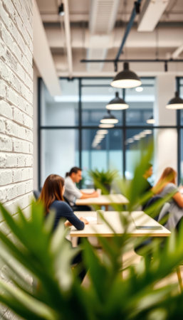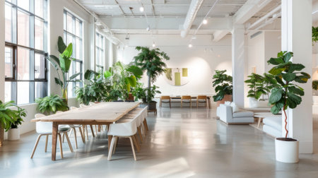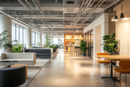 Modern eco friendly office interior design showing sustainable elements and innovative aesthetics