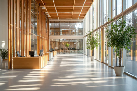 Interior of a modern office building with glass walls and wooden floor