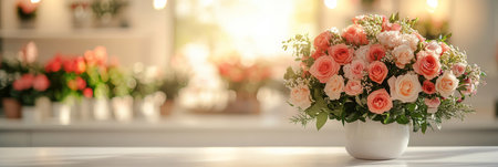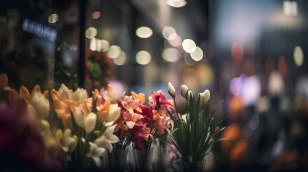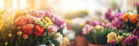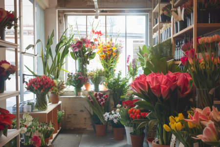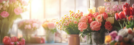 Colorful bouquets of roses tulips and daisies fill the flower shop with vibrant hues and natural light during the morning.