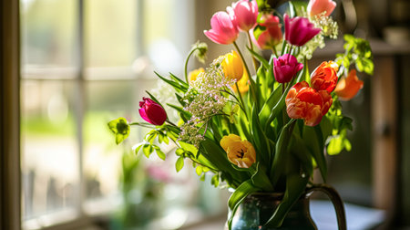 A close-up shot of a bouquet of fresh spring flowers including tulip.