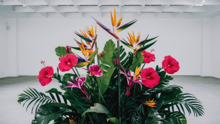 A vibrant arrangement of tropical flowers and lush greenery is displayed against a minimalist white backdrop.