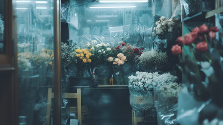 A beautifully arranged flower shop featuring an array of vibrant and colorful blooms wrapped in cellophane. Soft lighting adds charm.