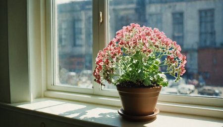 Geraniums with vibrant pink and green hues sit in a terracotta pot, soaking up warm sunlight streaming through a window, creating a peaceful atmosphere in an urban environment.