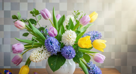 A vibrant and colorful bouquet of spring flowers is showcased in a simple white vase, sitting on a wooden surface. The arrangement features light purple and bright yellow tulips, interspersed with clusters of blue and white hyacinths. The background consists of a modern, geometric patterned wall with shades of gray and white, creating a pleasing contrast with the bright colors of the flowers. The scene evokes a feeling of freshness, celebration, and the arrival of spring.