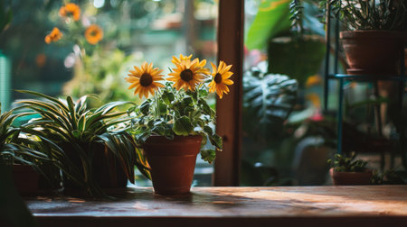 A sunny composition featuring potted sunflowers on a rustic table in an indoor garden with blurred greenery in the background.