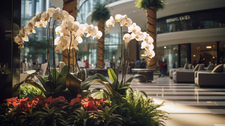 Shopping center decorated with flowers orchids.