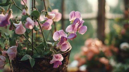 Sweet pea flowers climbing a handmade wire frame in a garden pot, morning dew, vintage greenhouse backdrop.