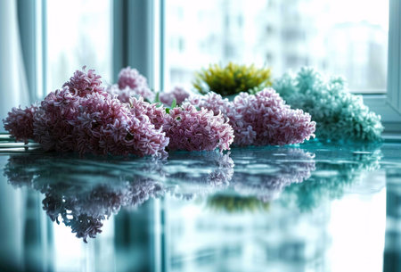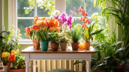 An array of potted houseplants and colorful flowers beautifully arranged on a shelf, adding a touch of botany and vibrant hues to the interior design