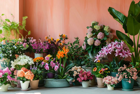 A delightful arrangement of colorful potted flowers fills a charming space, showcasing a variety of blooms against a warm, pastel pink backdrop, inviting visitors to enjoy the beauty of nature.