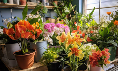 flower shop with a variety of exotic flowers and plants, created with generative ai