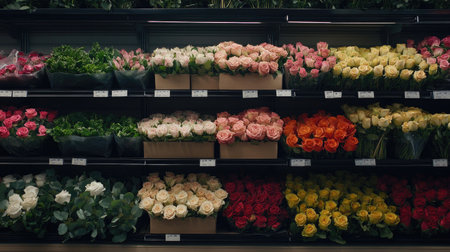 Close-up of grocery store flower shelves showcasing colorful mixed bouquets and fresh roses, arranged neatly for a vibrant display.