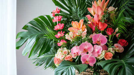 A stunning floral arrangement featuring vibrant orchids and tropical leaves, perfect for adding elegance to home decor, weddings, or special events.