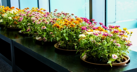 A vibrant display of flowers in a greenhouse setting, with various species in bloom, showing their colors and textures. The light filters through the window, illuminating the plants and creating a warm atmosphere.