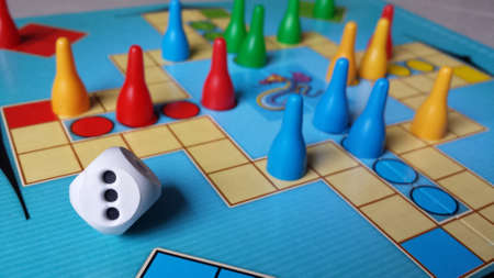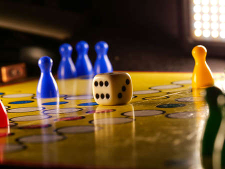 Yellow, green and red plastic dice and chips in children's board games. Selective focus