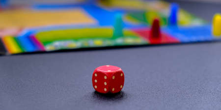 A close up view of a single dice placed on a board game, showing the numbers on its faces.