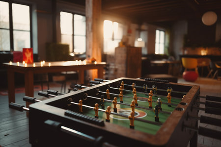 Close-up of players on a table football game (foosball), symbolizing competition, teamwork, and leisure activity.