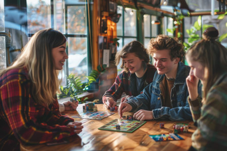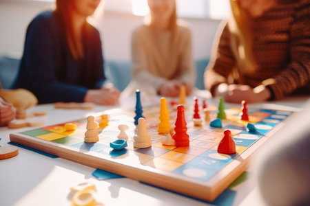 Process of playing tabletop board game on the table, fun with friends and family in room indoors, board game party concept, company group of students adults play board games, roll the dice on game map