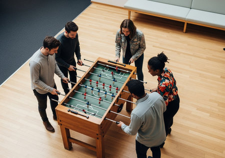 Coworkers enjoying break time playing table football, having fun and bonding over friendly competition in the office