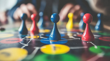 A vibrant collection of board game components, featuring colorful dice, tokens, and cards organized for an exciting game night experience with friends and family.