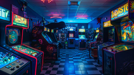 Retro arcade game machines lined up in a colorful room with neon lights, evoking nostalgia and entertainment AI