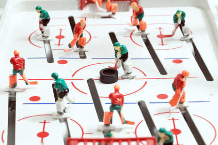 Close up on players of Table football soccer kicker foosball top-table game playing