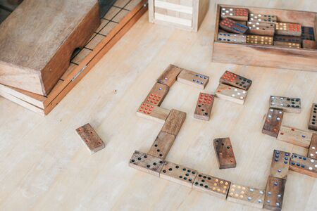 Playing traditional wooden domino game on wooden table background.Family board game, Game night vintage dominos in a row on old rustic table game.Concept of domino effect, chain reaction, risk manage.