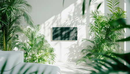 A white living room with green plants and trees, a TV mounted on the wall, a white sofa, a front-facing view, in a minimalist style, high resolution, high detail, high-quality photography, high definition, high contrast, high color saturation, professional lighting, professional color grading. --ar 53:30 --v 6.1 Job ID: 26b95143-1a38-4f22-8159-0c40ac84f266